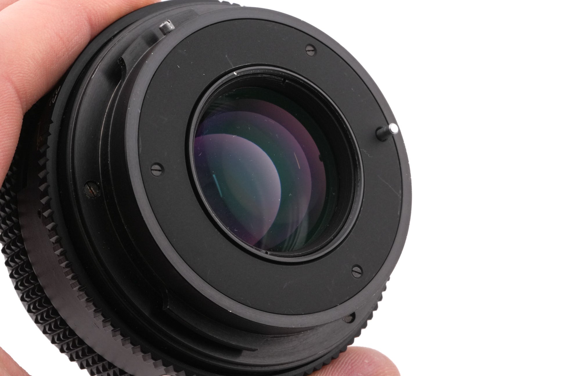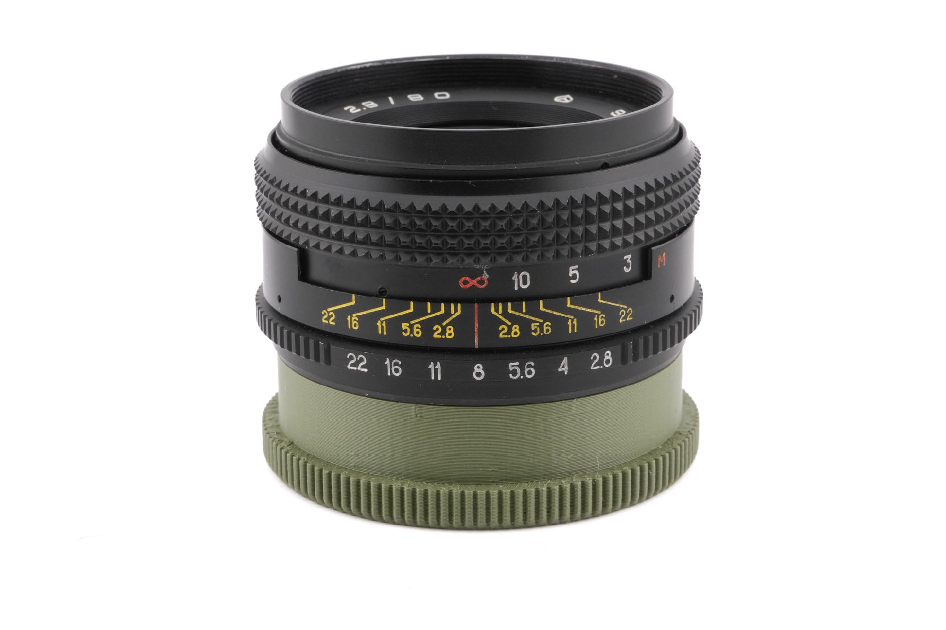 Manual focus normal lens made for Pentacon Six mount 120 SLRs in the Soviet Union. Metal body available in black.