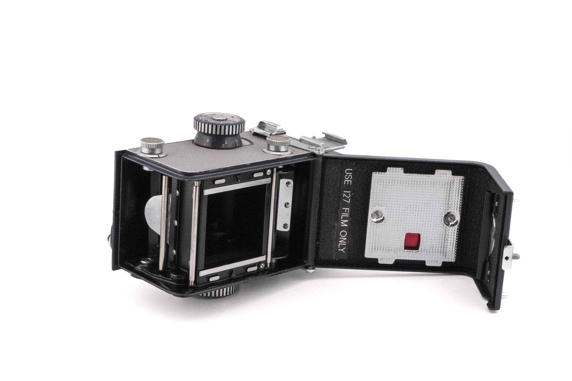 Manual focus 127 film TLR camera introduced in 1959 by Yashica. It produces 12 4x4 exposures on one 127-roll of film. Metal body available in black, dark gray & brown/burgundy.