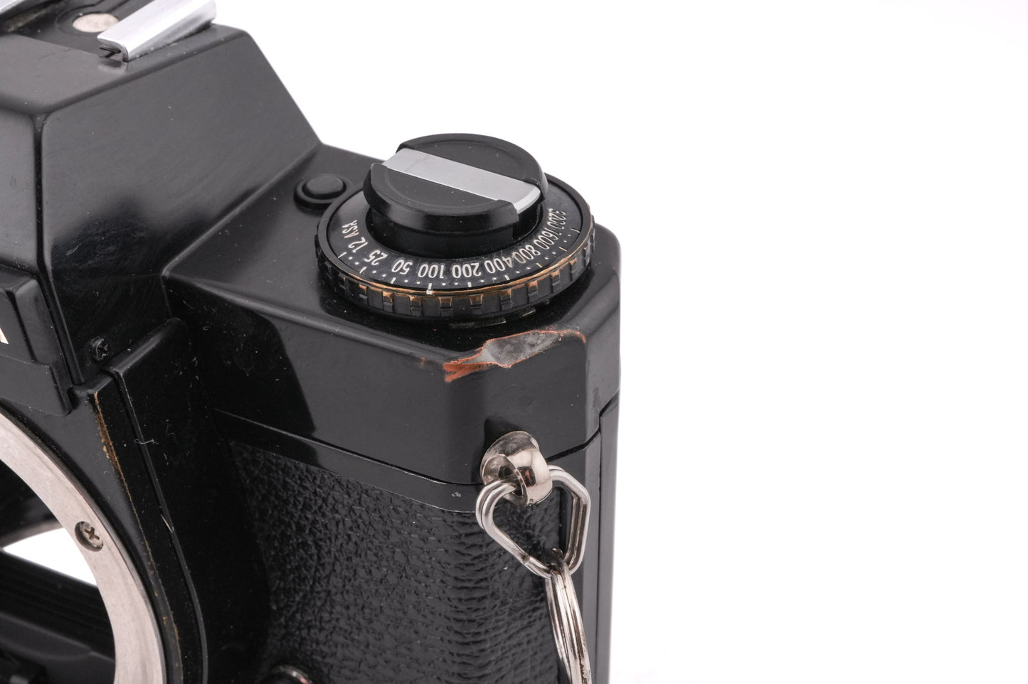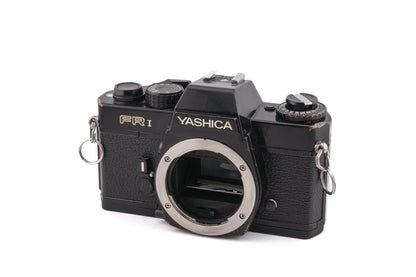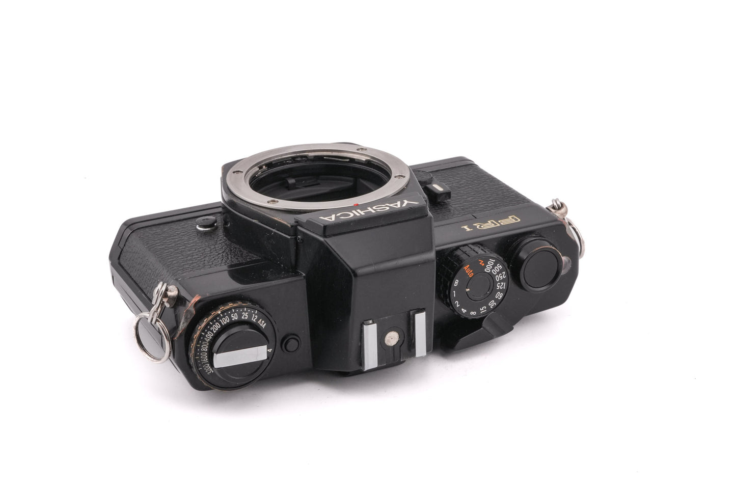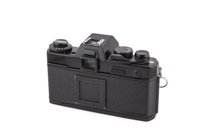Manual focus Contax/Yashica mount 35mm SLR introduced by Yashica in 1977. The shutter is electronically controlled. Metal body available in black.