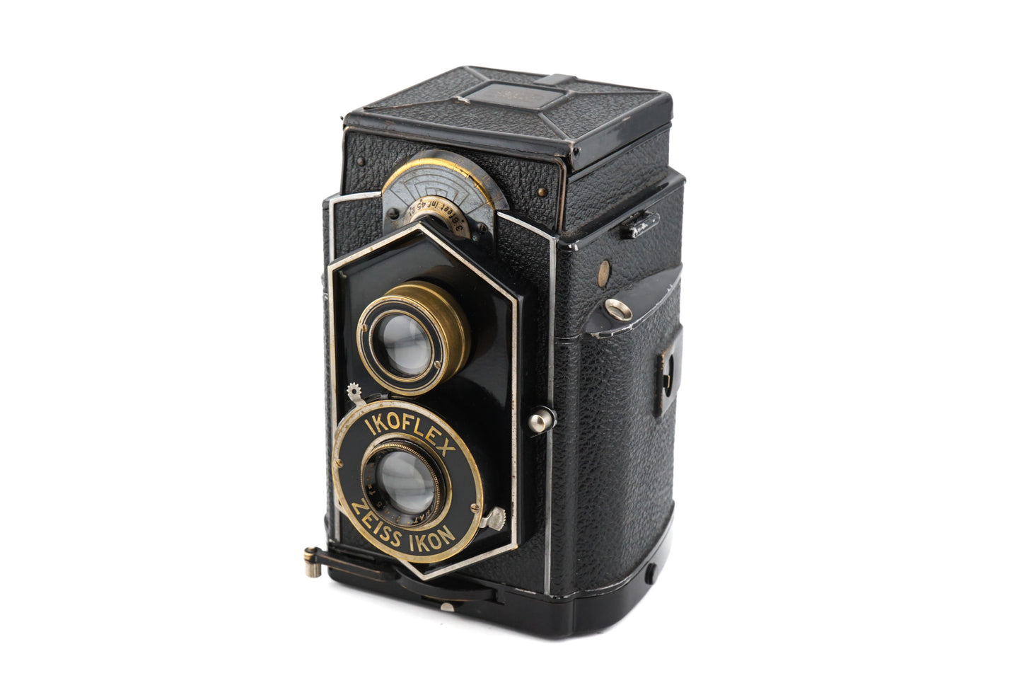 Manual focus 120 TLR released by Zeiss Ikon. This is the first Ikoflex model and is known as the "coffee can" model due to its unique shape. This shape is a function of the film loading/winding mechanisms, which are sideways relative to Rollei cameras of the time. Metal body available in black.