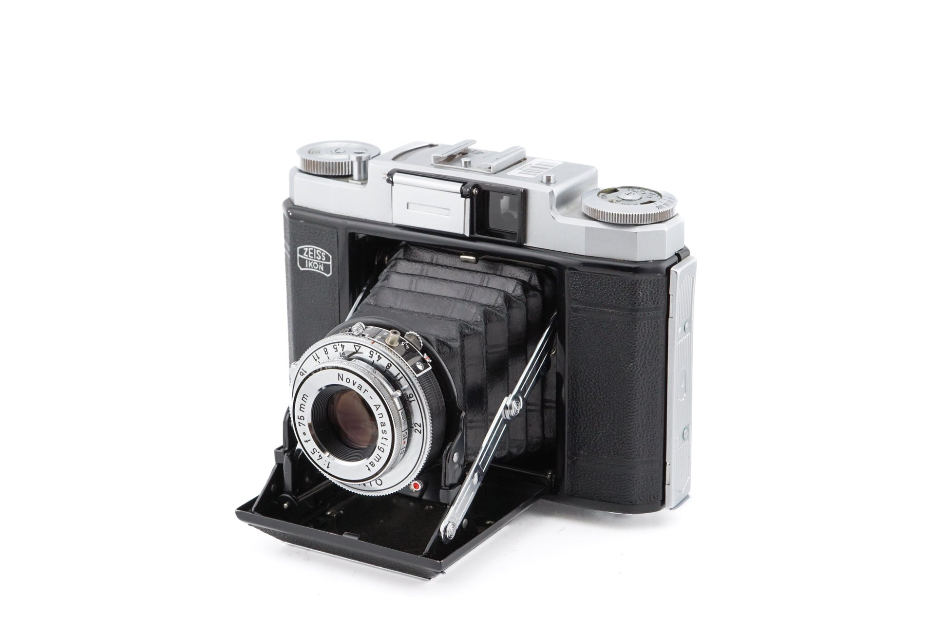 120 roll-film manual focus 6x6cm folding camera made by Zeiss Ikon introduced in 1954. Has a built-in uncoupled selenium cell light meter and a self-timer. Metal body available in silver.